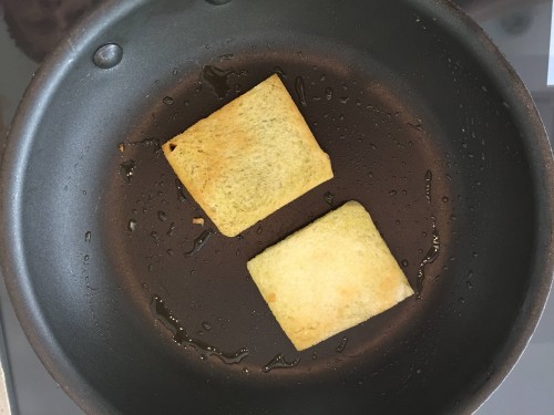 – Remove the crust from the slices of bread and fry on both sides in a little olive oil until golden brown. Cover with ham and cut diagonally into triangles.